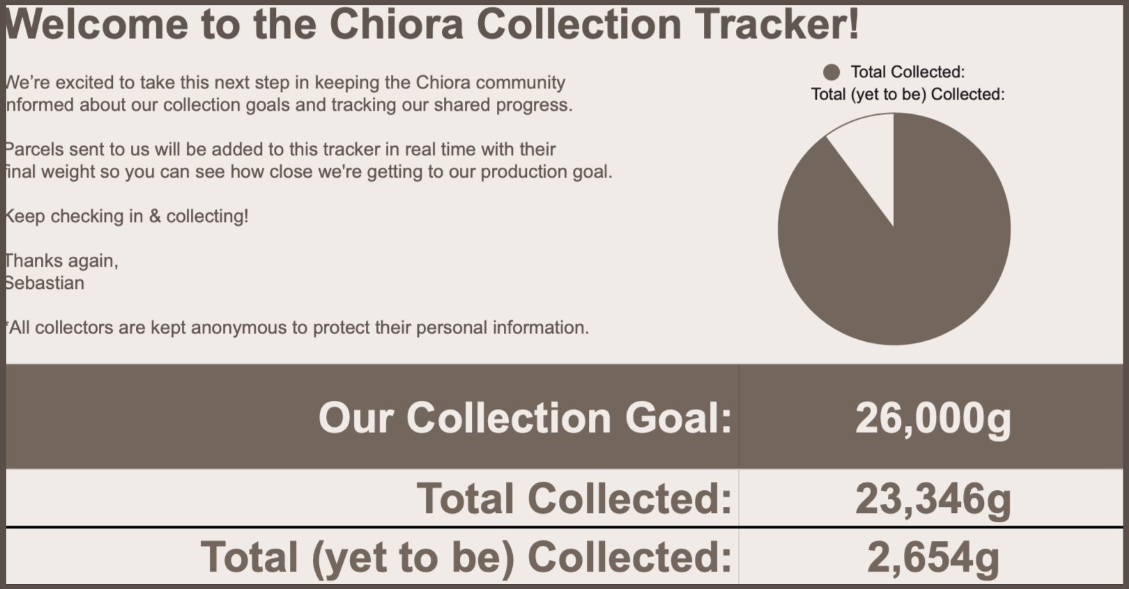 The Chiora Collection Tracker is a live record of all the brushed-out undercoat sent to us by our community. Each parcel is carefully weighed upon arrival and added to the total in real time, allowing you to see exactly how much material has been collected and how close we are to our next production milestone.